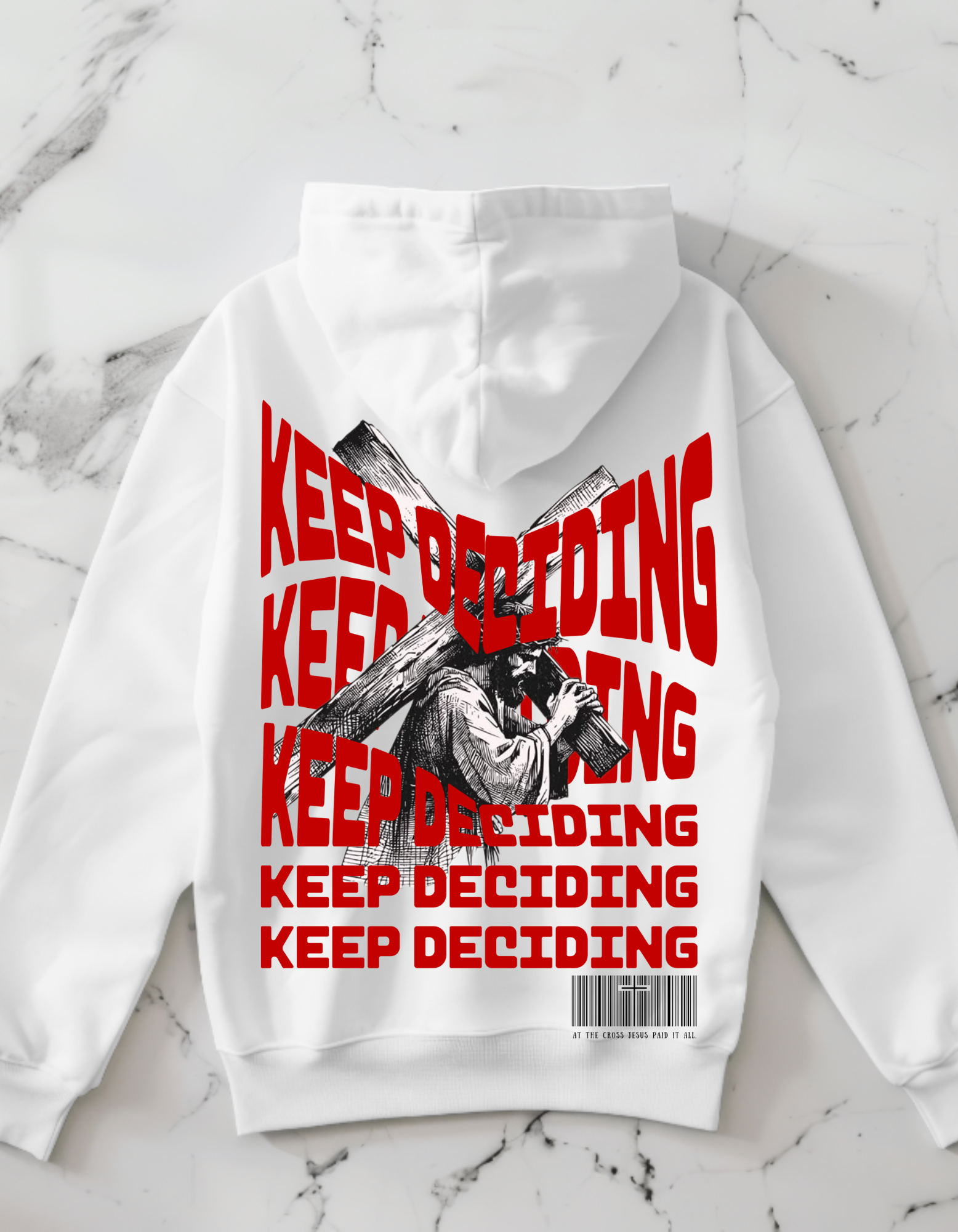 The Keep Deciding hoodie is a powerful visual reminder that faith is a daily choice. Featuring layered text and a detailed graphic of Jesus carrying the cross, this design speaks to the struggle, sacrifice, and strength required to keep choosing Christ every single day. Printed in bold red on a crisp white backdrop, it's a wearable testimony and conversation starter.